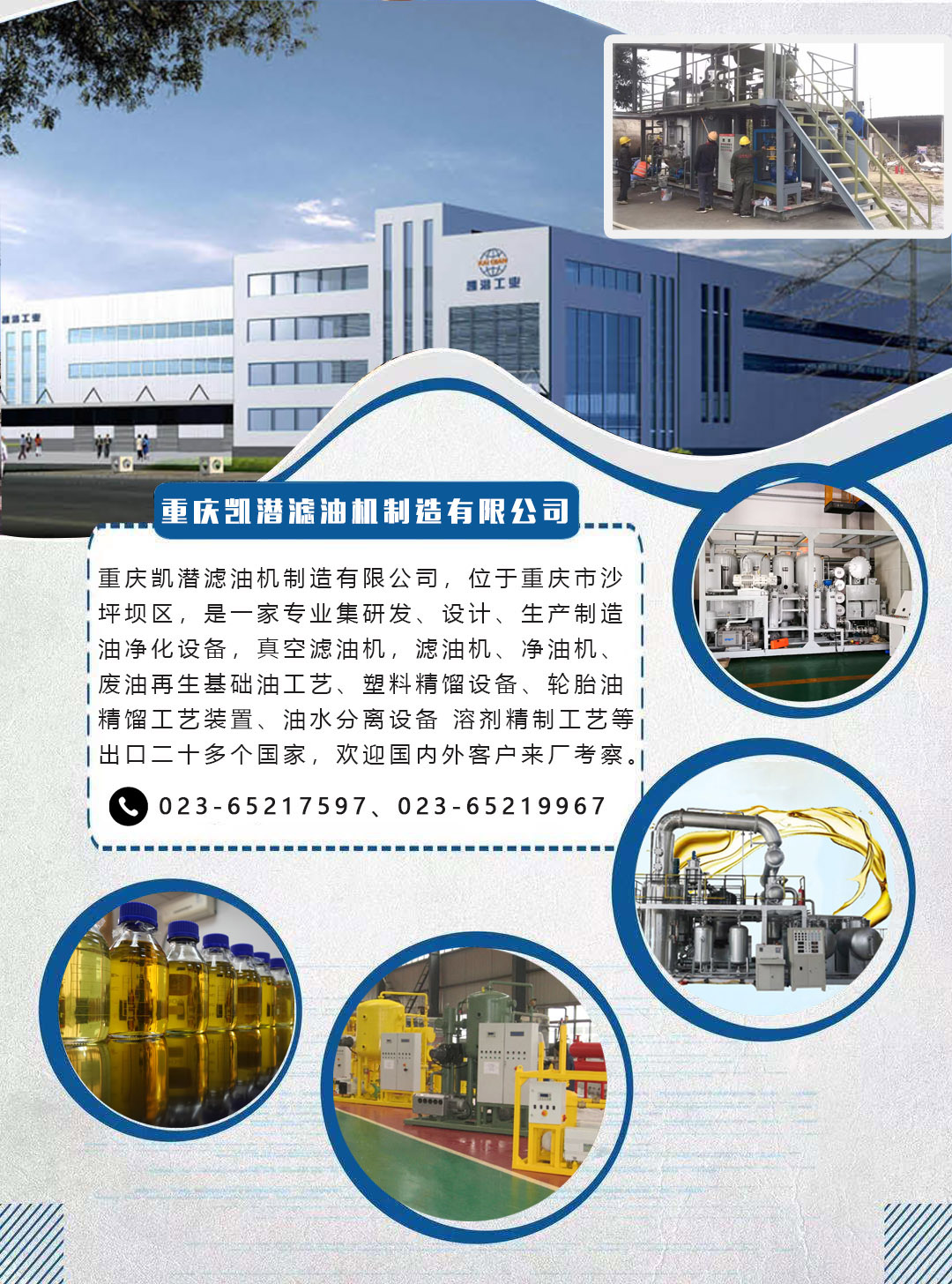 重慶凱潛濾油機制造有限公司,位于重慶市沙坪壩區,是一家專業集研發、設計、生產制造:廢機油蒸餾基礎油、基礎油溶劑萃取設備、廢油減壓蒸餾基礎油成套裝置設備、廢機油蒸餾基礎油、基礎油溶劑萃取設備、廢油減壓蒸餾基礎油成套裝置設備、廢油提煉汽柴油裝置、塑料柴油精制、輪胎柴油精制、濾油機、真空濾油機、變壓器油濾油機、出口濾油機設備為一體的企業。